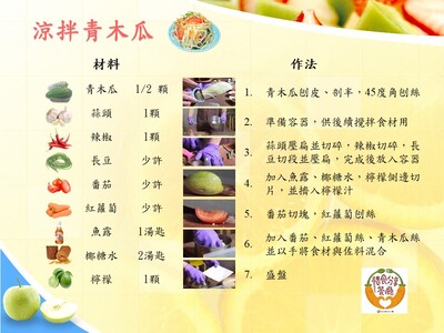 - 【新北市訊】新北市政府農業局為拯救食物不被浪費,推動「惜食分享餐廳計畫」,除了協助媒合餐飲業者使用來自全臺各地的「蔬果格外品」,也與惜食分享餐廳合作推廣惜食理念。粩泰泰-泰式料理的老闆葉佳濬曾向泰國大廚學習泰國料理,店內的料理都很道地。農業局為分享異國好滋味,邀請粩泰泰-泰式料理協助拍攝料理影片,民眾在影片中看到私房食譜,還可以知道讓料理更美味的小撇步,有興趣的民眾不妨趁連假期間,在家輕鬆做美味的異國料理。