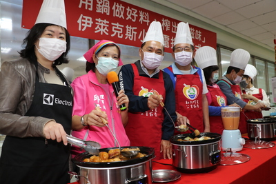 永和區民權社區發展協會愛心志工,利用伊萊克斯的果汁機現打鳳梨汁和木瓜汁,並用慢燉鍋燉煮扣肉滷蛋和紅燒獅子頭滷白菜,侯友宜和余倩梅幫忙長輩打菜,忍不住稱讚志工好手藝,兩人並留下來與長輩一起開心共餐。