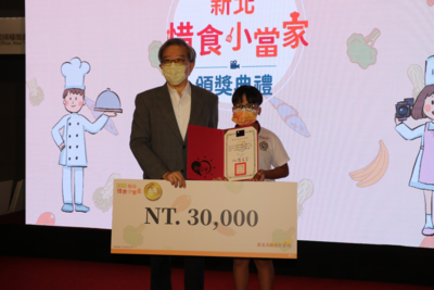 【新北市訊】新北市政府為推廣惜食教育,舉辦惜食小當家徵影比賽,經評審出20組作品獲獎,於13日在市府一樓頒獎。獲得首獎的是新市國小郭開元同學,因學校推廣食農課程進而投入惜食烹飪,他以NG醜蔬果做成雞肉蘑菇燉飯,獲得評審青睞,獨得3萬元獎金,他說要捐1萬元給育幼院,1萬元給學校持續推廣食農教育,獲得與會者熱烈的掌聲鼓勵。